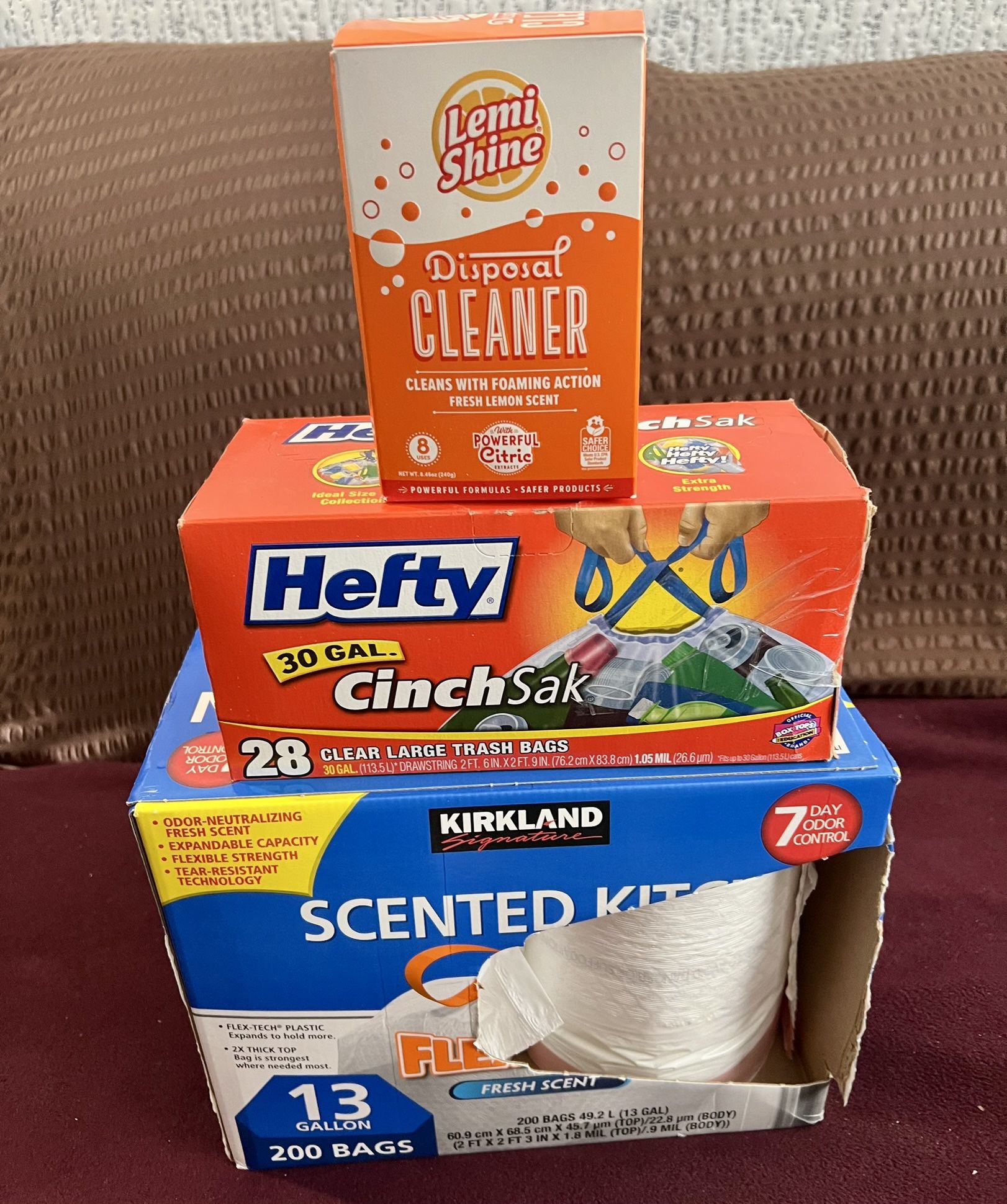 Almost full box of Kirkland 13 gallon scented trash bags, almost full box of Hefty 30 gallon cinch sacks. Will throw in 3/4 box of garbage disposal cleaner pods. Asking $10 for it all. *** MESA ***