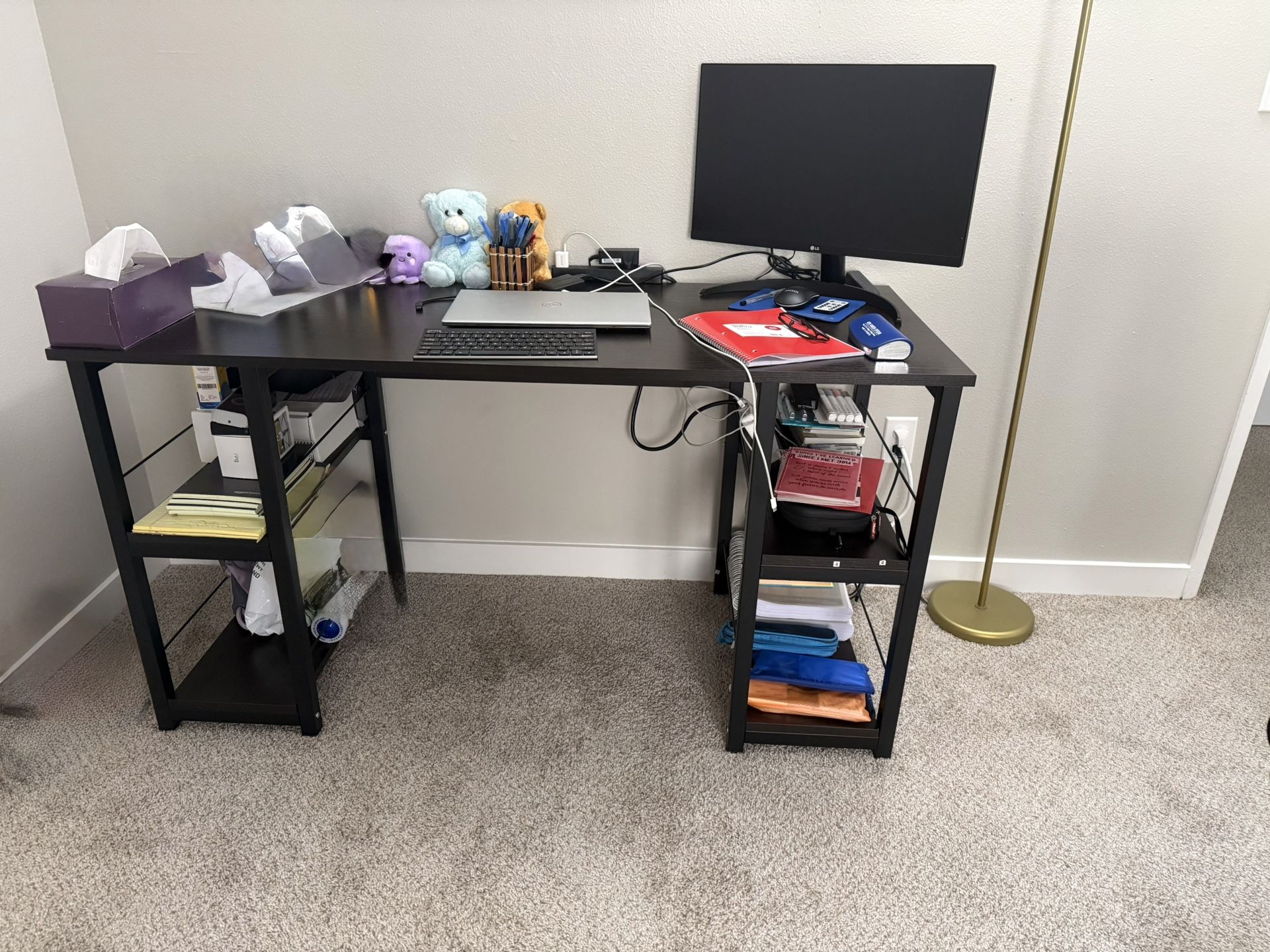 55 inch wooden office desk with side shelves to stack stationary. No scratch and well used table. Comes from pet and smoke free house