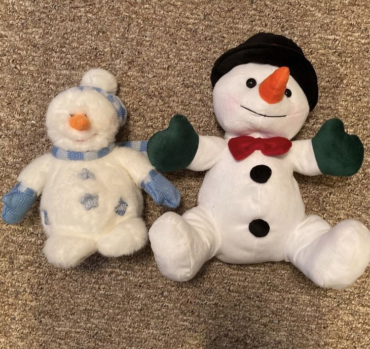 2 plush Snowman One with black hat is approximately 15” high And the other one(Ganz heritage collection)is a approximately 10” tall. Both are like new condition.
