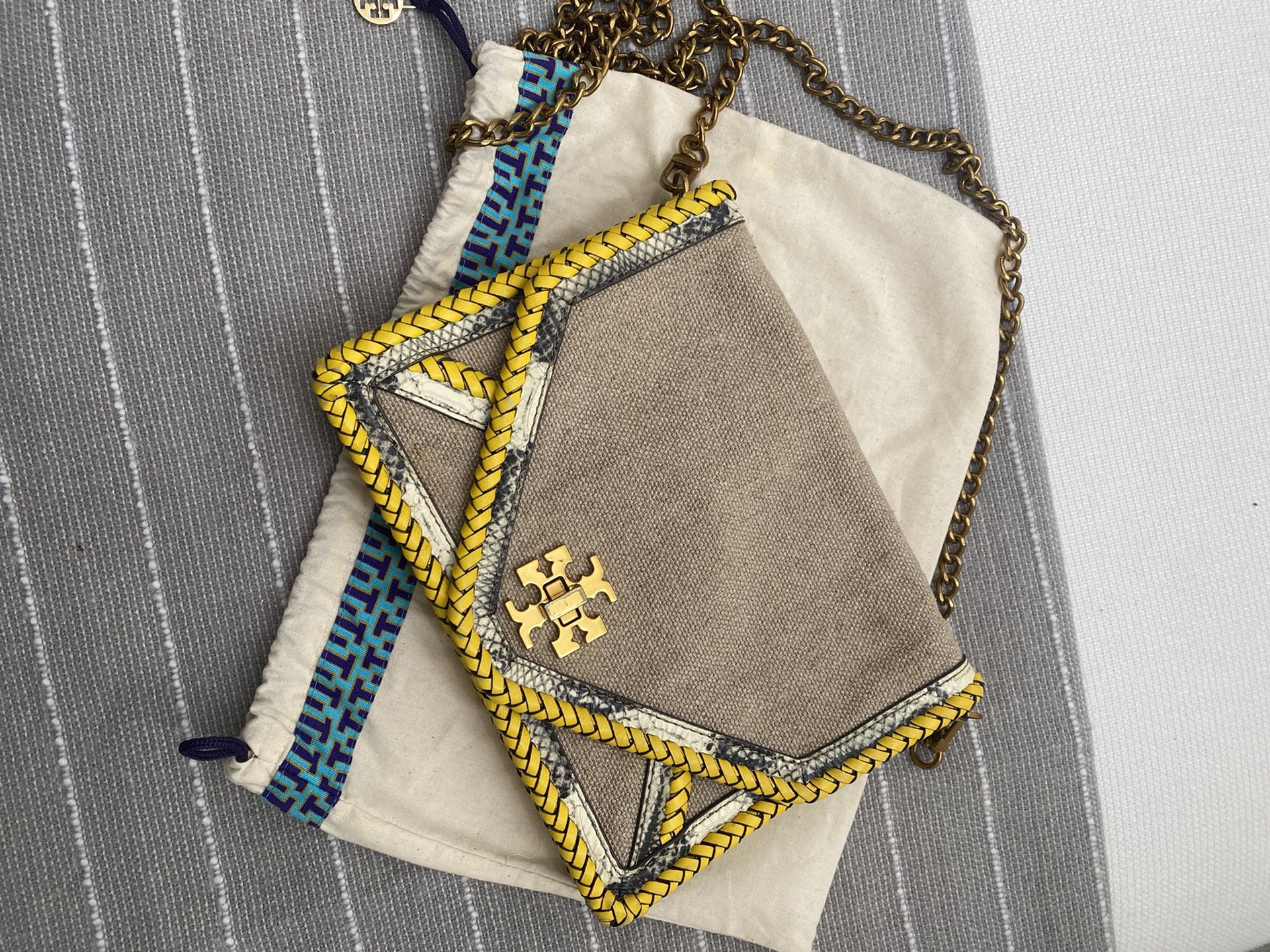 Yellow , snake print & linen material Pick up only Gold hardware on logo a damaged as shown on picture
