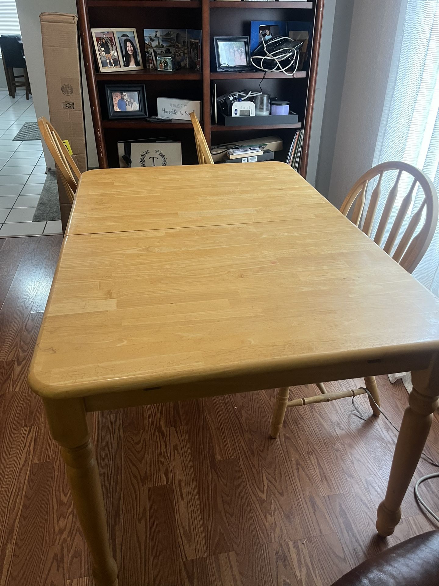Solid wood dining table and 5 chairs. 3 of chairs match table and other 2 are a different color wood but can easily be painted. 54 x 36 when leaf is out 66 x 36. Very sturdy. Pick up only