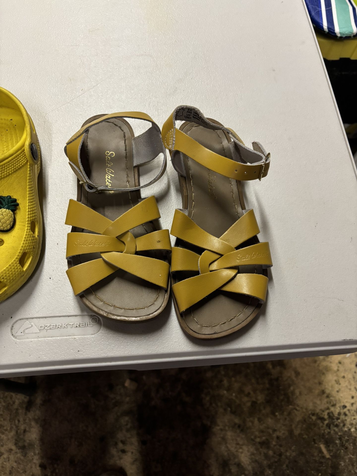 Original saltwater sandals. Original crocs. Don’t fit anymore. Saltwaters were only used a couple times at the most. Crocs are more used. Crocs are 4 women. Sandals are size 3 big kids.