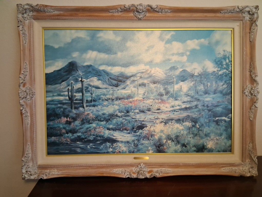 Marty started her own art school. In 1974, after traveling throughout England, Marty painted a few English scenes which promptly sold. From that point on, her life was not the same. Many paintings were selling even before she could complete them and what began as a hobby, had become a thriving art business. Her creations were sought by collectors, decorators and design firms. She gained international popularity and is considered the premiere painter of the English countryside. Dimensions are 31.5( W) x 42.5 (L). Pick up only.