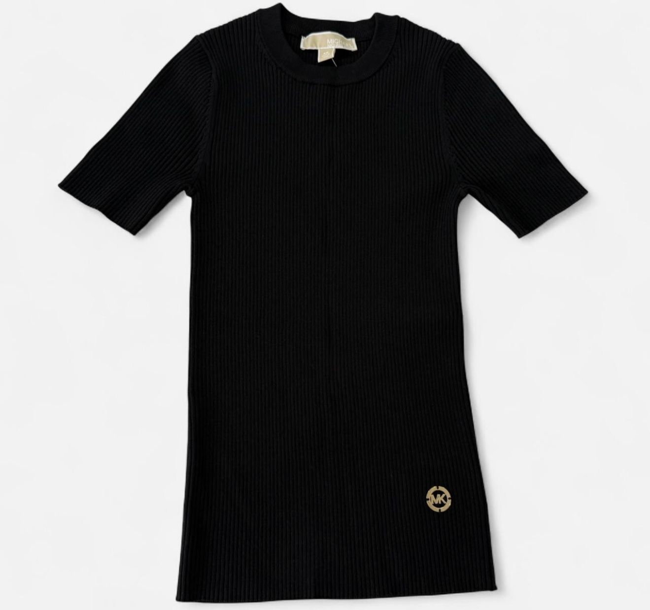 Michael Michael Kors Color: Classic Black Size: XS (Extra Small) Material: Ribbed knit fabric offering a soft stretch fit Design Details: Slim-fit silhouette Short sleeves Crew neckline Subtle gold Michael Kors logo detail at the lower hem Condition: Brand new with tags Original Price: $125.00 Made in: China Perfect For: Minimalist everyday wear, pairing with blazers, skirts, or denim for an effortlessly chic look.