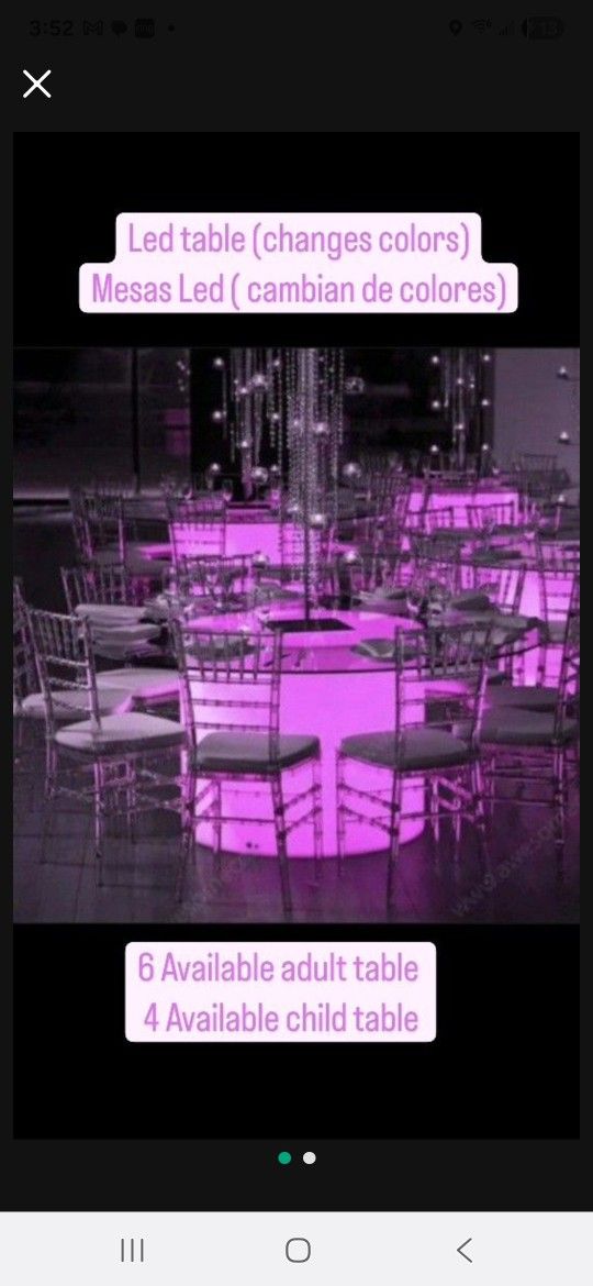 LED TABLES AND CHIVALRY CHAIRS WITH LEATHERETTE CUSHIONS. NEW IN BOXES NEVER USED: *TABLE CHANGES COLORS 6 ADULT LED TABLE + 4 KIDS LED TABLES 70 CHIVALRY CHAIRS + 45 KIDS CHIVALRY CHAIRS ALL CHAIRS INCLUDES WHITE LEATHERETTE CUSHIONS. TABLE AND CHAIRS $7500 ONLY CHAIRS WITH CUSHIONS $4500 ONLY TABLES $3500 NEW IN BOXES/ NEVER USED NEVER OPEN. Mesas y sillas por $7500 Solo las sillas con cojines $4500 Solo las mesas $3500 TODO ES NUEVO EN CAJA NUNCA USADOS Sillas con cojines blancos Tengo 70 de adultos y 40 de ninos Mesas adultos 6 y ninos 4