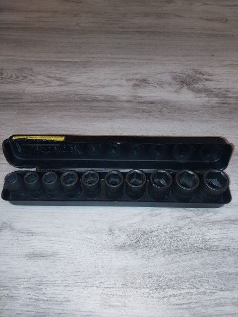 Pittsburgh 10pc 1/2" Impact Metric 11-24mm Socket Set. High-visible markings, Heat-Treated Chrome Vanadium Steel black phosphate finish to withstand corrosion with steel carrying case. Very good condition, used only twice