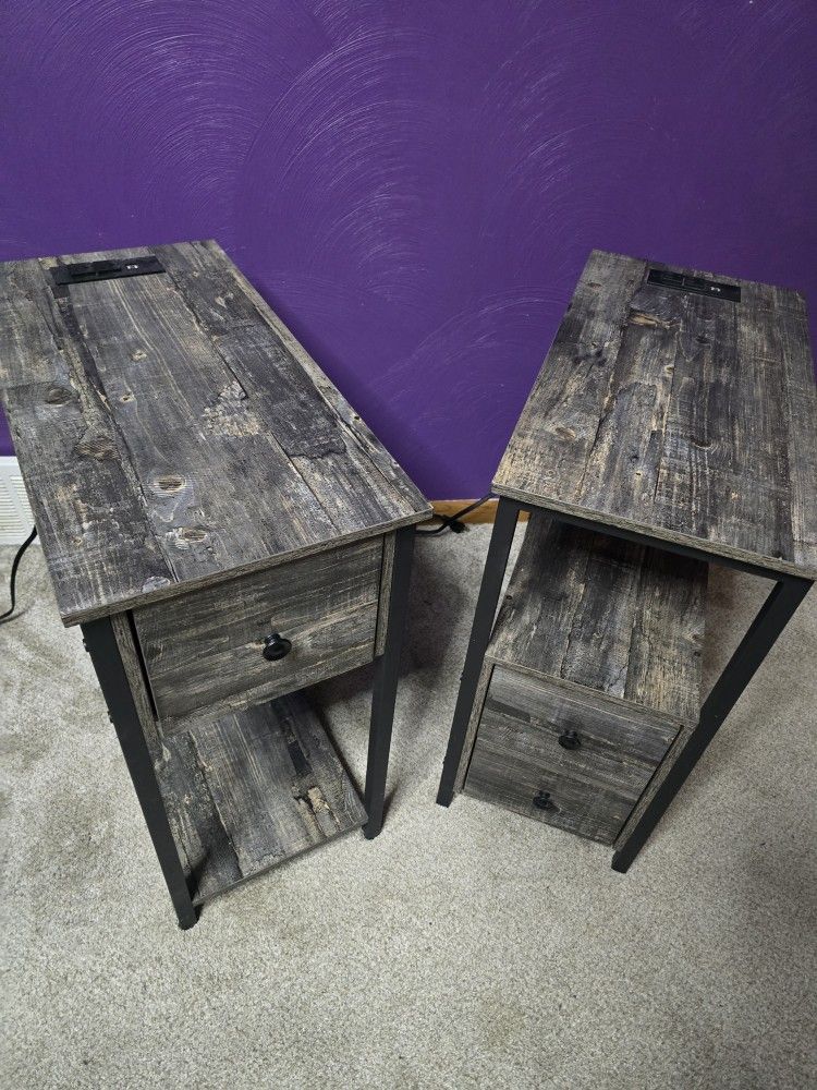 2 end tables with outlet sockets Dimensions are for both L x W X H 23 5/8 in x 11 3/4 in x 24 1/4 Drawer Pull out Length is 9in. 1 table has top drawer storage with open bottom storage 1 table had open top storage and 2 drawer bottom Dont have room for them anymore Asking $150 obo