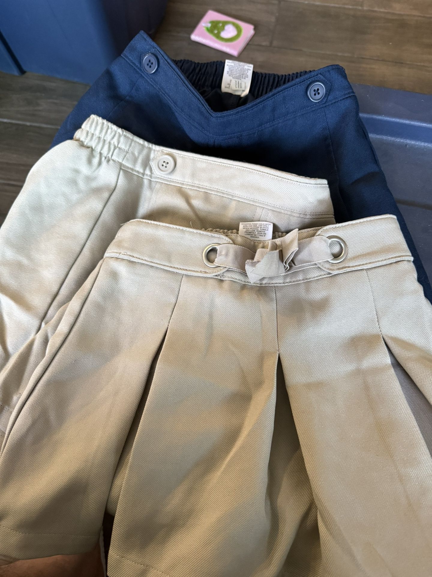 Girls khaki and navy blue school uniforms. Been in container clean. Size 5 . 5$ a piece or will do 20$ if you take the 5. Two navy blue, 3 khakis.