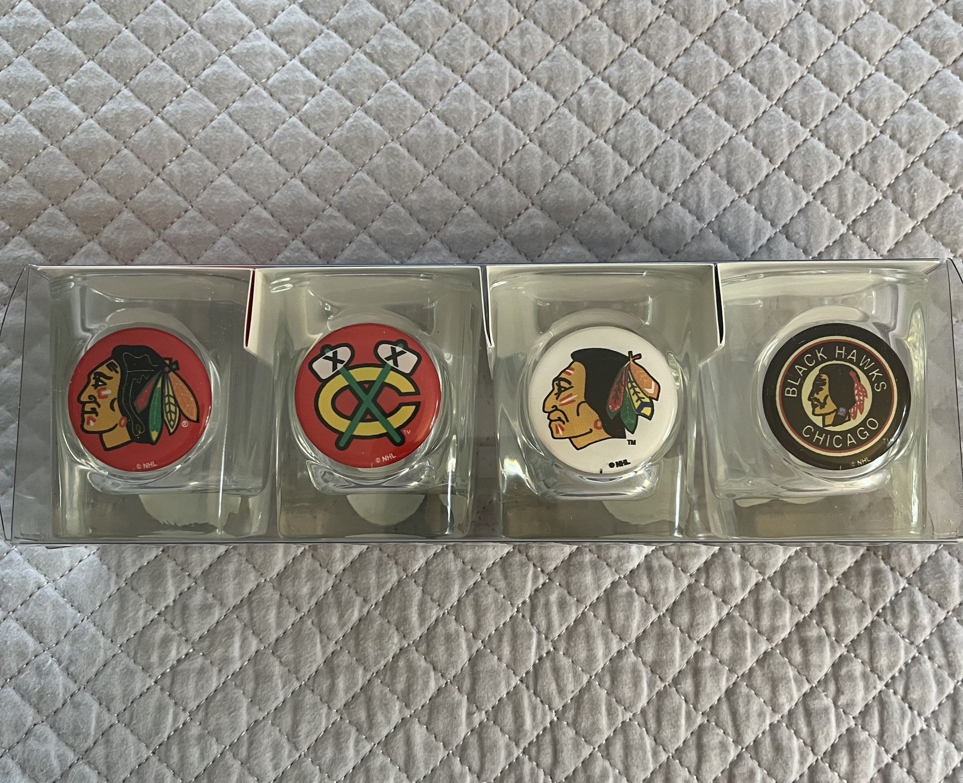 4 cool collectible shot glasses with 4 different logos. New and unopened.