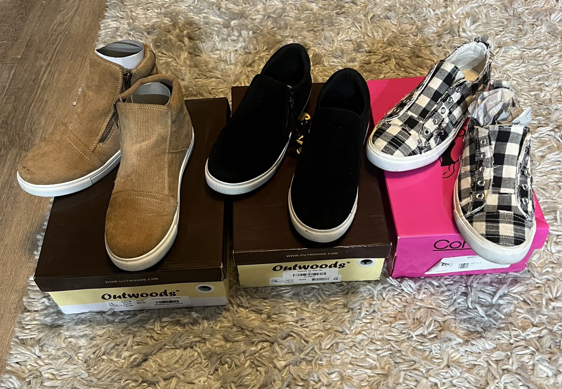 Beige high top shoe Size 6, black shoe with zipper size 6, black & white plaid shoe size 6, used a few times all in good condition. Tan and black pairs are SOLD.