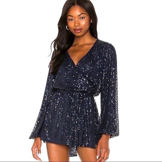 Free People Christa Sequin Romper Womens Large Brand New with Tags Shine bright in this so special romper featured in a sequin-adorned fabrication with wrap-front detailing and exaggerated sleeves for added shape. Deep V-neckline Tie closure at front Skirt-inspired bottom piecing (32)
