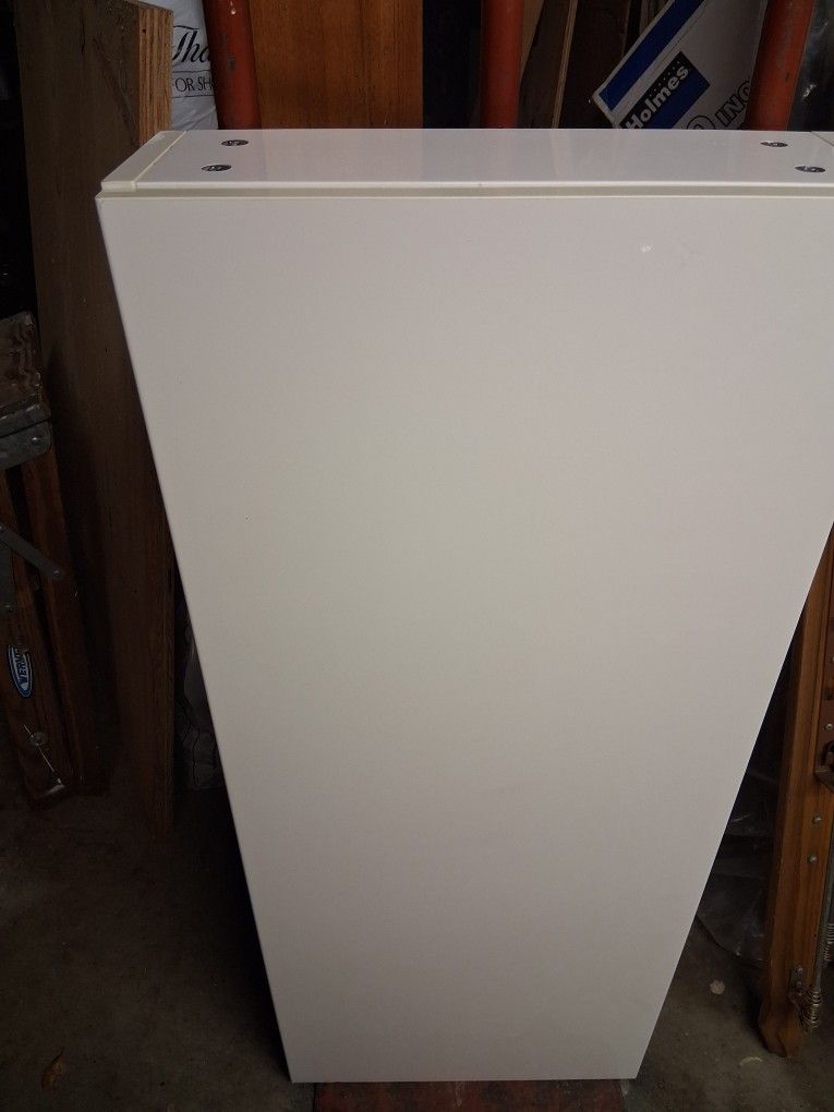 Wall cabinet with pegs inside. Missing the shelves. It's a nice cabinet. Very sturdy. 38 inches tall 16 inches wide 51/2 inches deep