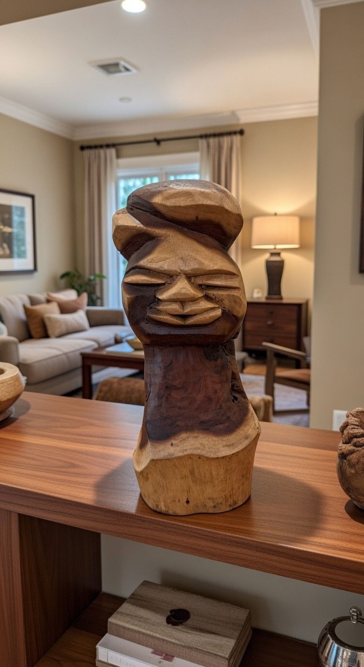 Vintage hand-carved wooden sculpture dated 1984, crafted in an ethnic / folk art style. This unique piece features a stylized human face with strong geometric forms and beautiful natural wood grain. • Hand carved from solid wood • Signed and dated 1984 on the base • Vintage original, not a reproduction • Warm natural patina from age • Statement decor piece for shelf, table, or office Condition: Good vintage condition. Age-related wear consistent with hand-carved wood. There is a visible crack on the bottom/base (shown in photos), which does not affect stability. Approximate size: Height: ~11–12 inches (see photos with measuring tape) Perfect for collectors of folk art, ethnic decor, or unique vintage sculptures.
