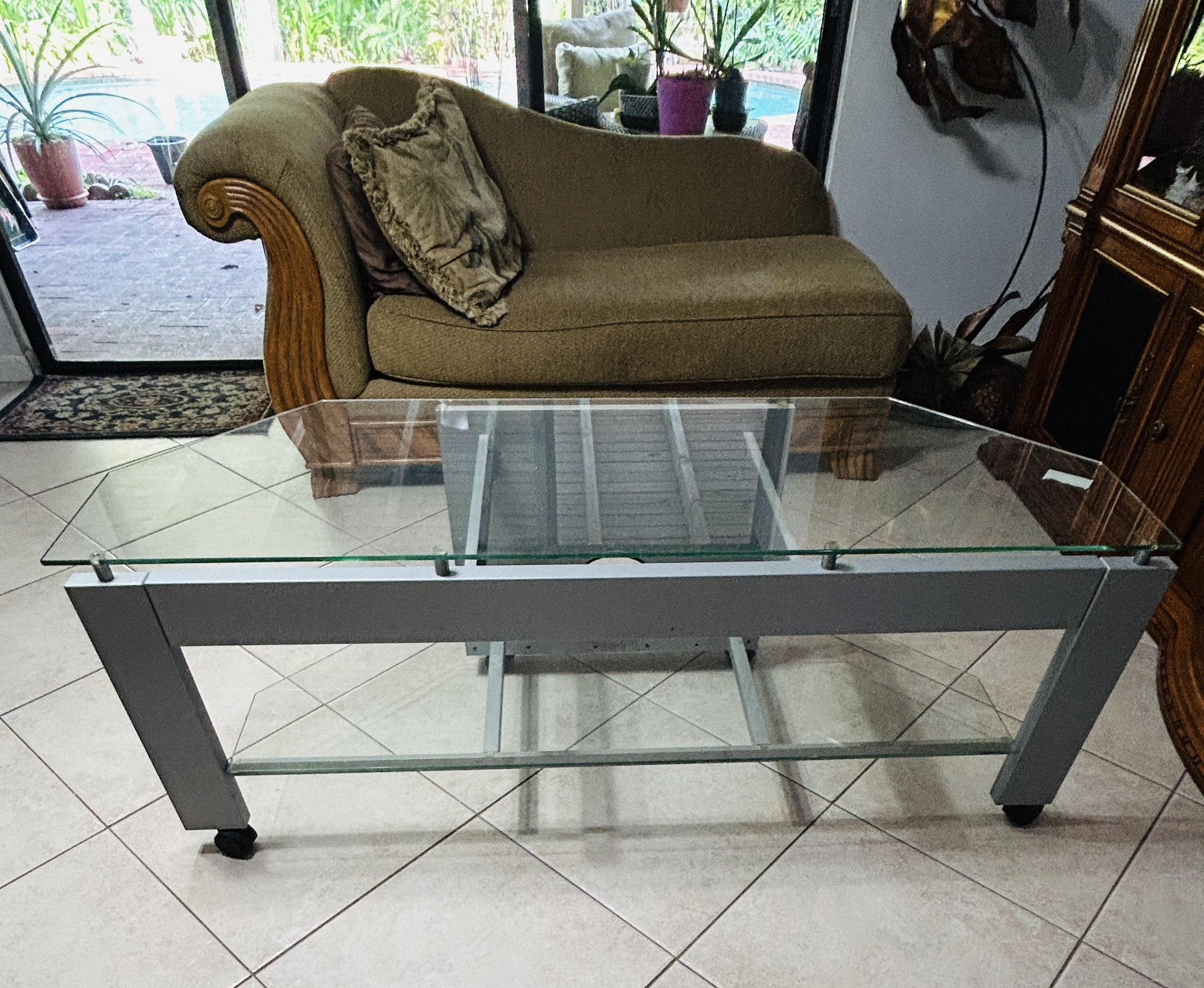 This is a modern glass and silver design TV stand. It is 58 1/2 inches wide by 20 inches deep. It is a double shelf TV stand. It is really pretty..
