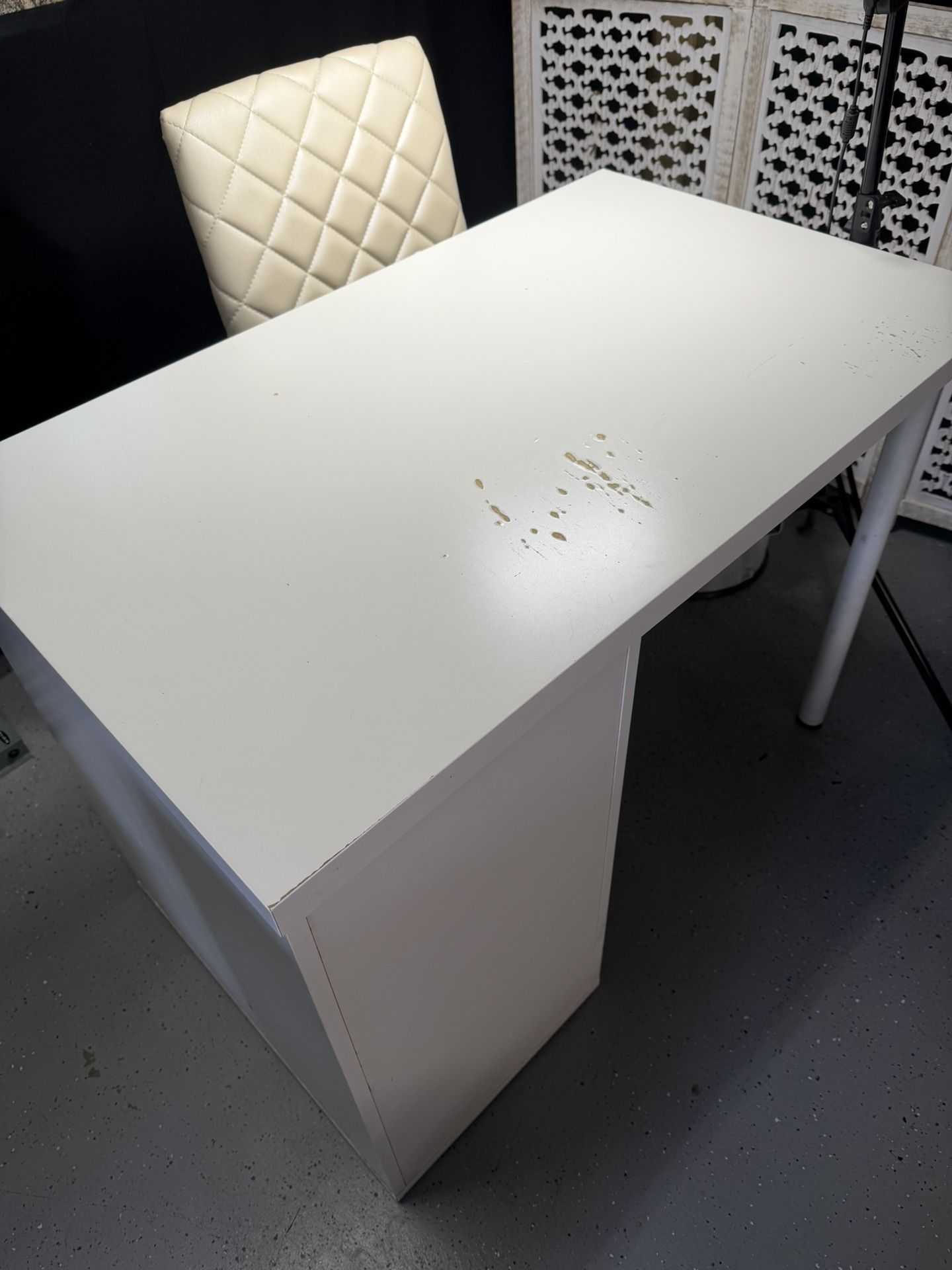 Used Nail / beauty desk that has a couple scuffs but is still great to use ! Has Drawers on side for storage as well