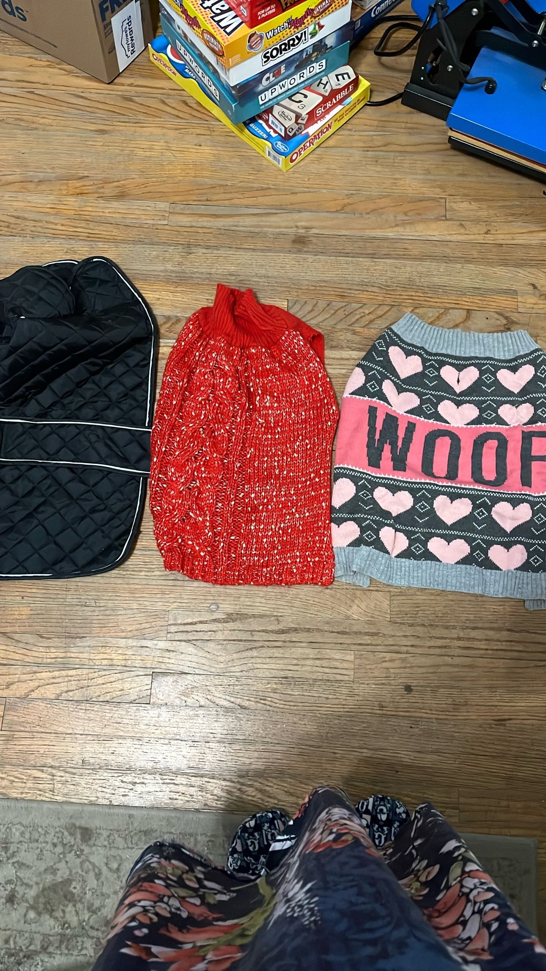 2 lawn signs, 2 K9 Advantix II flea application for dogs 55lbs and over, dog brush, 2 flea combs, and choice of 4 medium dog jackets/ sweaters or 5 small dog jackets/sweaters.