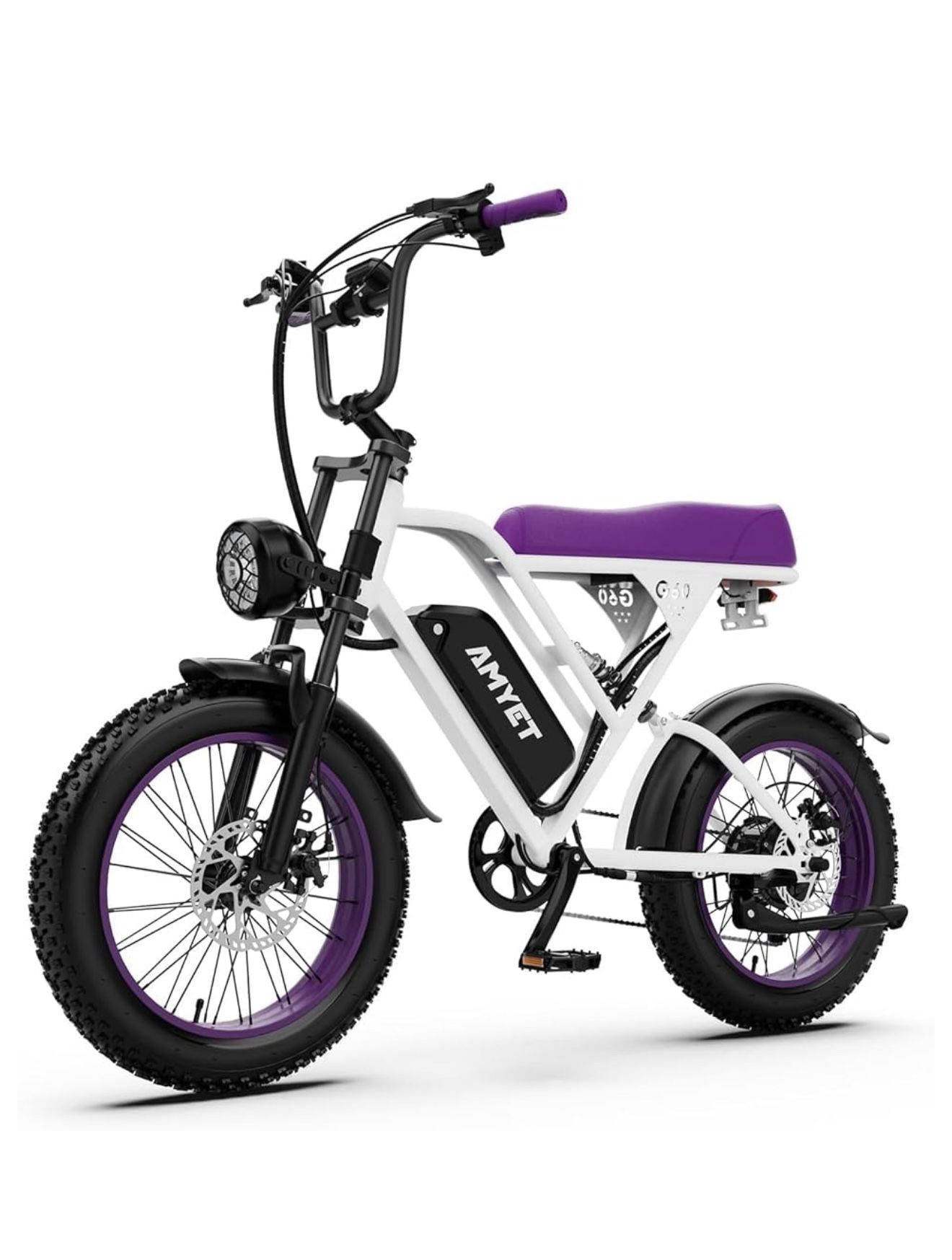 【Peak 1500W Brushless Motor】 Experience the exhilaration of our electric bike designed for adults, featuring a robust 1000W motor with a peak output of 1500W. Feel the wind in your hair as you effortlessly reach speeds up to 30MPH, making every ride an adventure of adrenaline and freedom. 【48V 20AH Battery】Our e-bike is equipped with a detachable 48V 20AH battery, providing an impressive range of 30-70 miles on a single charge. No more worries about running out of juice during your explorations. And with a quick 7-8 hours recharge time, you'll be back on the road in no time. 【20"&4" Fat Tire】Confront any surface with confidence thanks to the 4-inch fat tires that offer unparalleled stability and traction. Whether it's cruising along sandy beaches, navigating rocky trails, or conquering urban streets, our electric bike is ready to tackle any challenge that comes your way. 【Digital LCD Display】Stay in control and informed with the LCD display screen that provides real-time information on your speed, battery level, and more. Enjoy a smooth and comfortable ride, even on rough terrain, with the dual suspension system that absorbs bumps and shocks, ensuring every journey is a pleasurable one. 【7 Gears&Disc Brakes System】 Ride with confidence, day or night, the bright headlight, rear turn signal and brake light alert others to your presence.With the gears 7-speed and dual disc brakes, you can effortlessly shift gears and confidently stop, giving you full control over your riding experience. Choose from three working modes - pure electric, pedal-assist, or pure pedal - to suit your preferences and make every ride tailored to your needs. 【90% Pre-Assembled】The AMYET V9-G60 Electric Bike comes 90% pre-assembled, allowing you to kickstart your cycling journey quickly and effortlessly. With its easy setup, you'll be ready to hit the road in no time. Enjoy the convenience and efficiency of this electric bike as you embark on your riding adventures. 【Eco-Friendly and Cost-effective】By choosing AMYET electric bike, you not only reduce your carbon footprint but also save money on gas and maintenance costs. It is a sustainable and cost-effective mode of transportation.