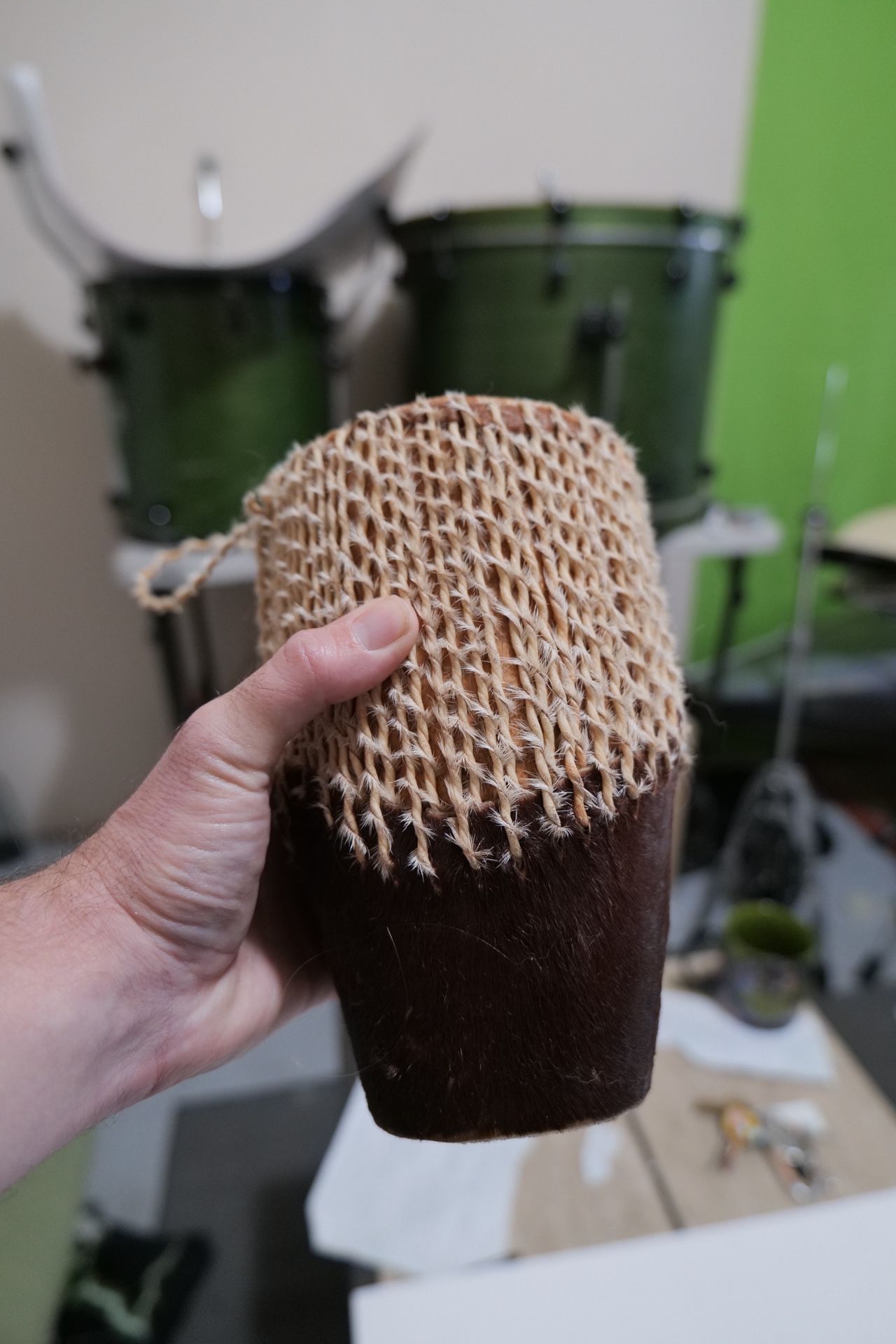 Handcrafted skin drum with an internal shaker ball, creating a rhythmic sound when played or moved. Small, lightweight, and easy to display. Perfect as a unique gift for drummers, percussionists, or music lovers, and also makes a beautiful accent piece for a studio or creative space. One-of-a-kind handmade item.