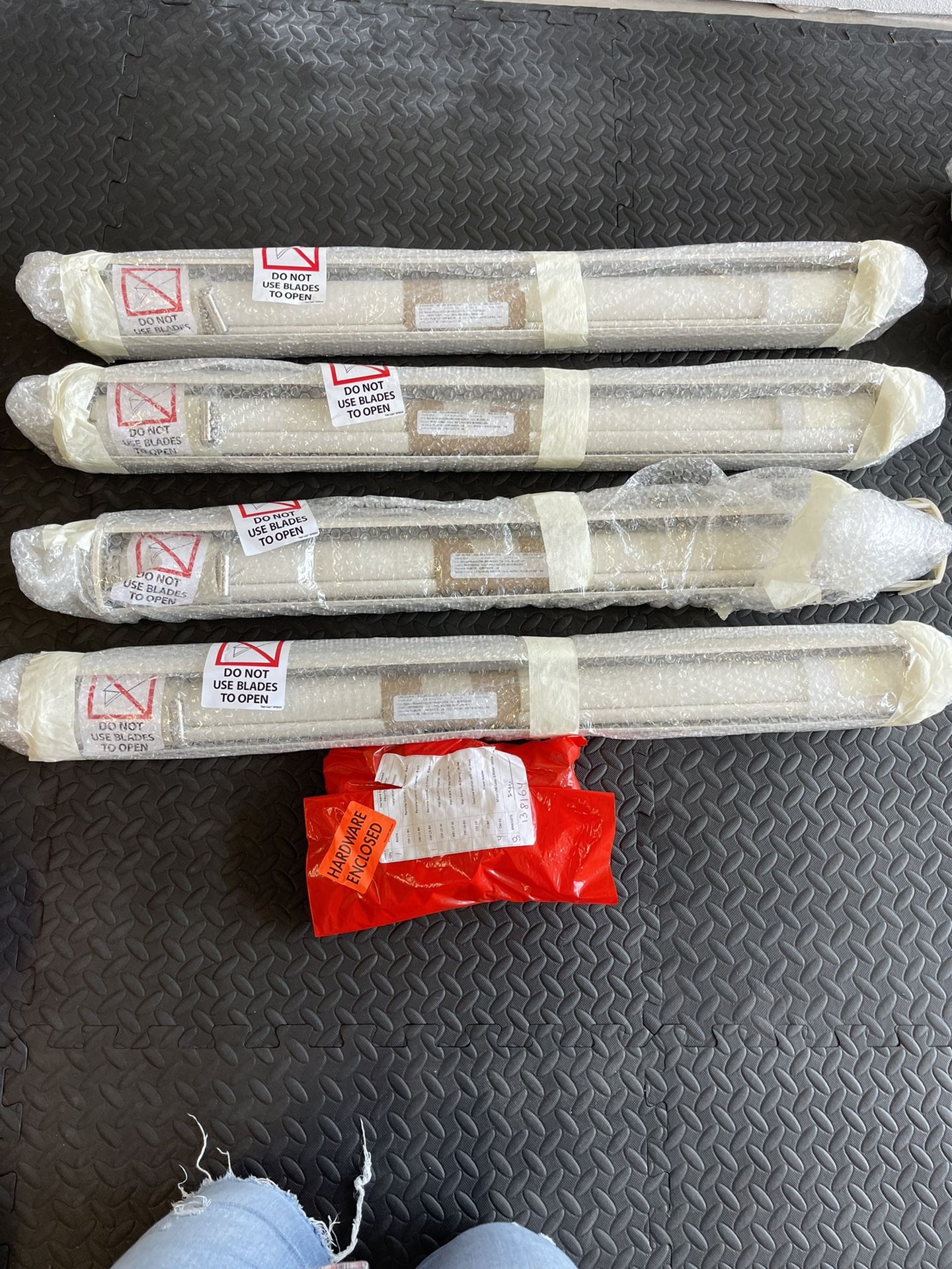 These blinds were sent to us from https://offerup.com/redirect/?o=YmxpbmRzLmNvbQ== and were the wrong color. The right color is the photo of the square. Milan Snow. Everything is new in packaging and stored in non smoking garage until we could list them for sale. Size is 33 7/8 x 58” each. Price is for the set as the remote is only one that works for all 4. Original cost is $ 1,000 for this set.