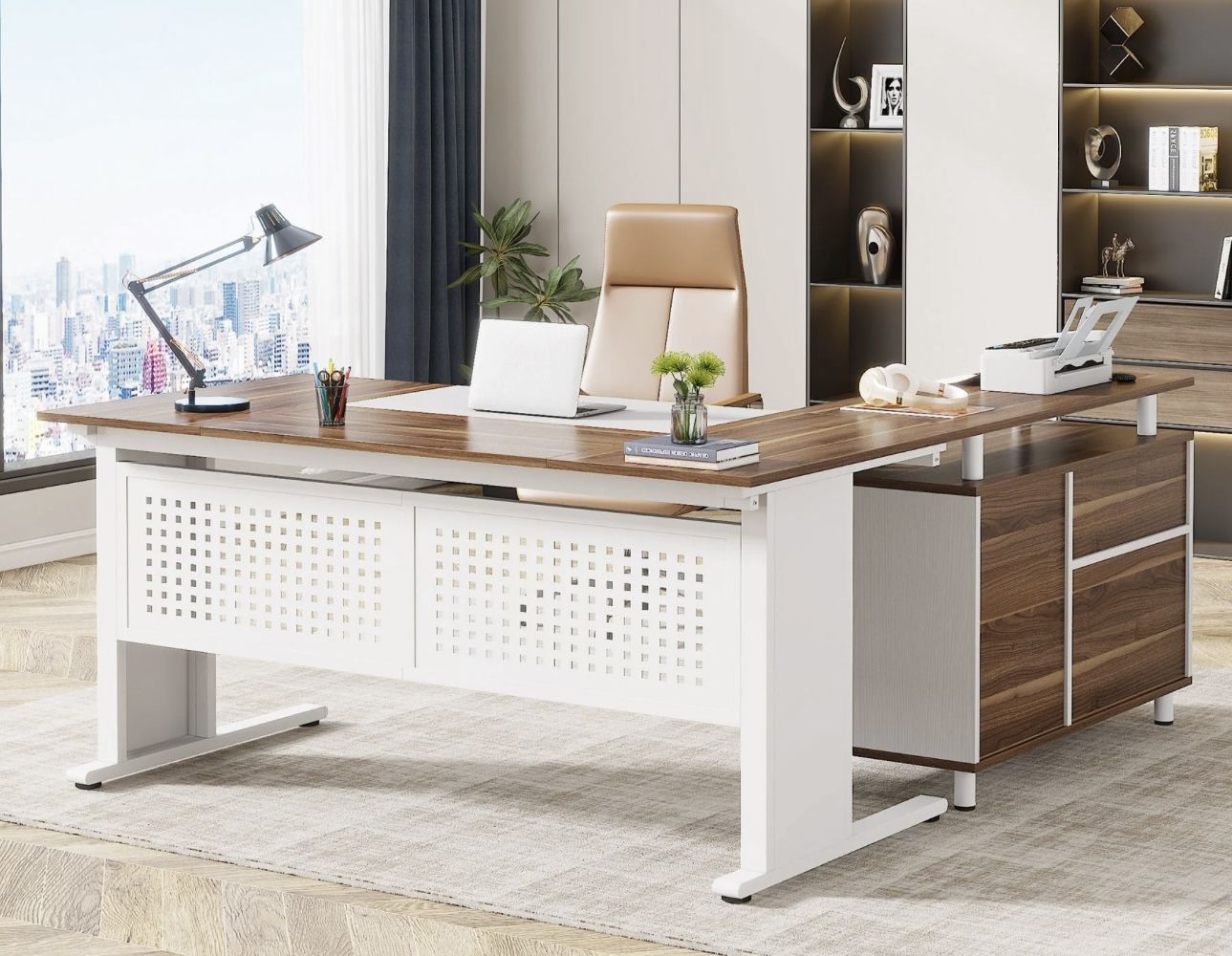 F1981AB Industrial L-Shaped Desk, 63" Computer Executive Desk with File Cabinet
