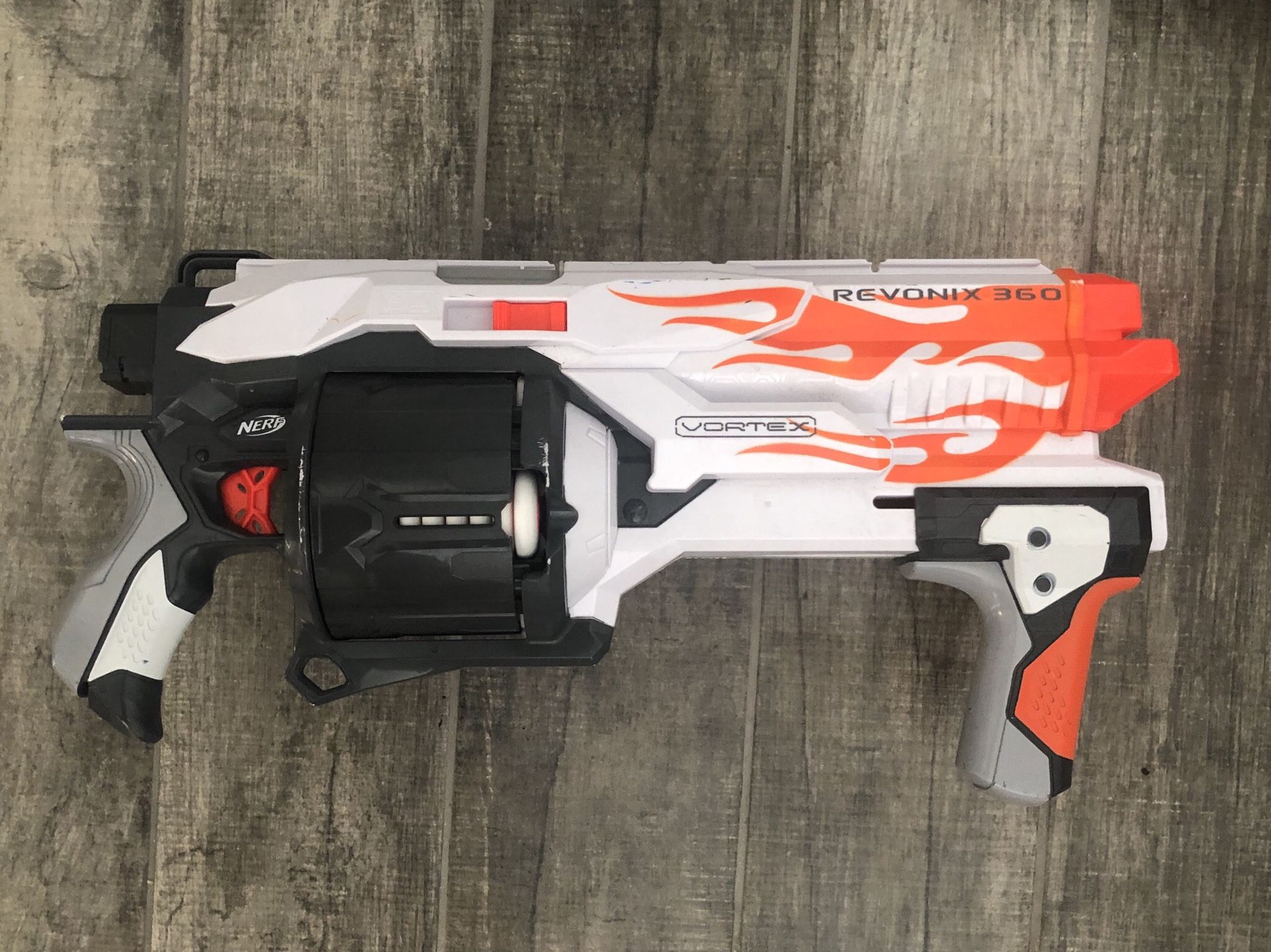 Hit the battlefield with long-range firepower with the Revonix 360 blaster! This is the farthest firing Vortex blaster yet and it comes with a huge ammo store of 30 long-range XLR discs. Hold down the trigger to unleash a constant stream of discs at your target as fast as you can slide the Slam Fire handle! The Roto-Action barrel rotates as you fire! With a range of 65 feet, you'll dominate the battlefield with the Revonix 360 blaster! Nerf and all related characters are trademarks of Hasbro.