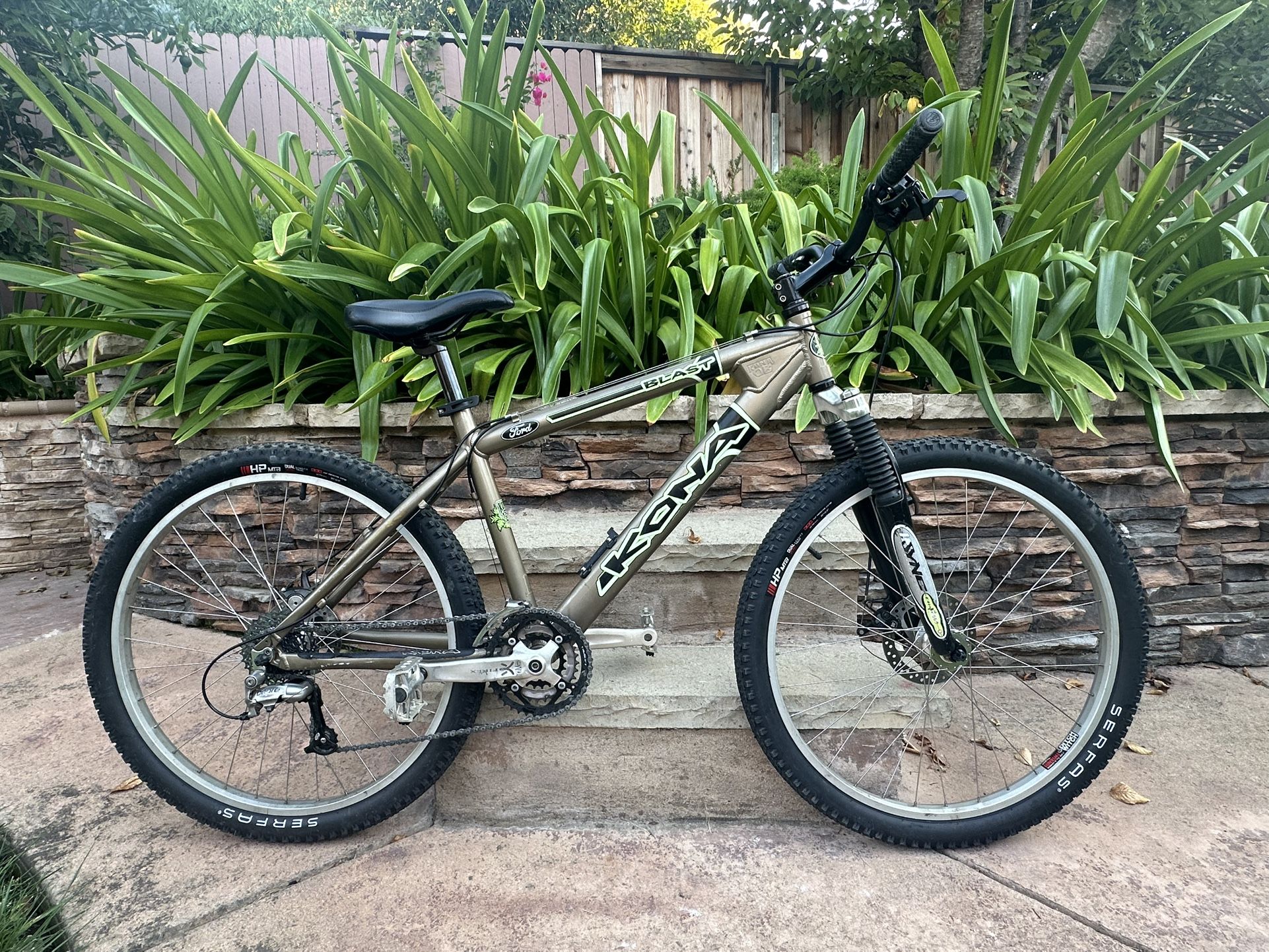 Kona Blast Mountain Bike comes in used/normal wear condition. It rides well and looks nice in olive green color. Frame size: 18” Wheel size: 26” Color: Olive/Green Frame & Fork: Frame Construction: TIG-welded Frame Material: 7005 aluminum, butted Fork: RST 281-EL, 2.5" travel Fork Materal: Aluminum, triple-clamp crown Components: Component Group: Mountain Mix Brakeset: Tektro 821A linear-pull brakes, Tektro 342 A levers Shift Levers: Shimano Alivio RapidFire Plus Front Derailleur: Shimano Acera top-swing Rear Derailleur: Shimano Deore Crankset: TruVativ 4D, 24/32/42 teeth Pedals: Platform with clips and straps Bottom Bracket: Shimano BB-LP27 Rear Cogs: 8-speed, 11 - 30 teeth Chain: Shimano CN-IG31, 1/2 x 3/32" Seatpost: Kona Thumb Saddle: SDG Comp Handlebars: Alloy riser Handlebar Stem: Kona Control Headset: WTB Momentum ST2 Wheels: Hubs: Front: Kona OB-1, Rear: Shimano Acera Rims: Mavic X138, 32-hole Front Tire: WTB PrimalRaptor Spoke Brand: Stainless steel, 1.8mm front, 2.0mm rear Spoke Nipples: Brass nipples