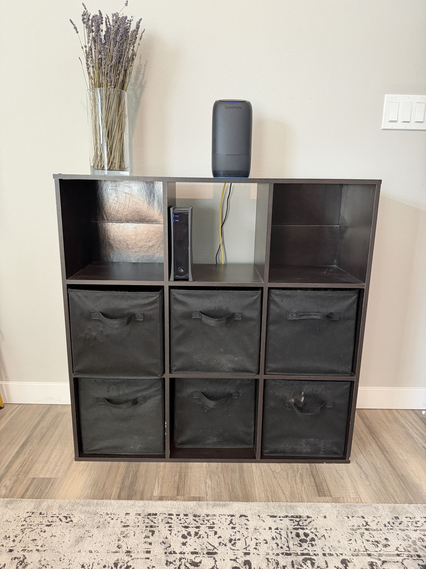 3x3 cube shelf Has noticeable wear and tear Perfect for storage area, closet, office, entryway, etc. Measures exactly 3 ft. X 3 ft. Only the 3x3 in the photos is included (does not include the fabric storage bins)
