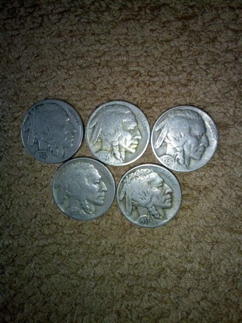Five Buffalo Nickels 1927, 1929, 1930, 1937, 1937