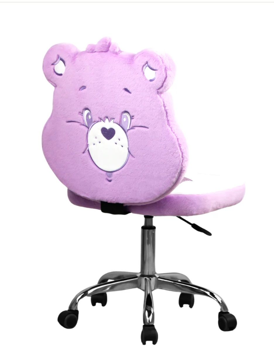 Figural Shaped Design Embroidered Details Ultra soft teddy fur fabric Padded with comfy polyurethane foam. The silver metallic base allows for a 360 degree spin and includes five-smooth rolling wheels. Adjustable seat height Simple assembly required.