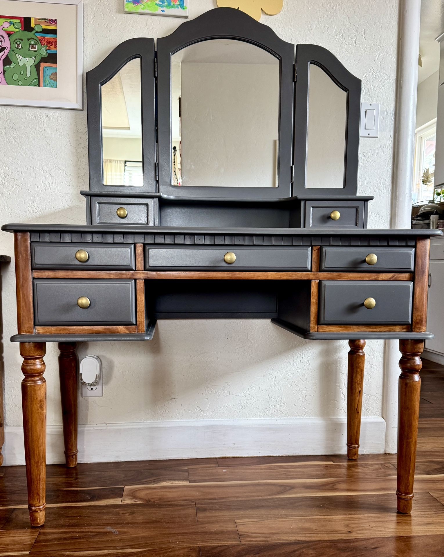 Refinished vanity. 42 in wide Without mirror 30.5 height With mirror 59.5 Depth 19 in Top piece is not bolted down