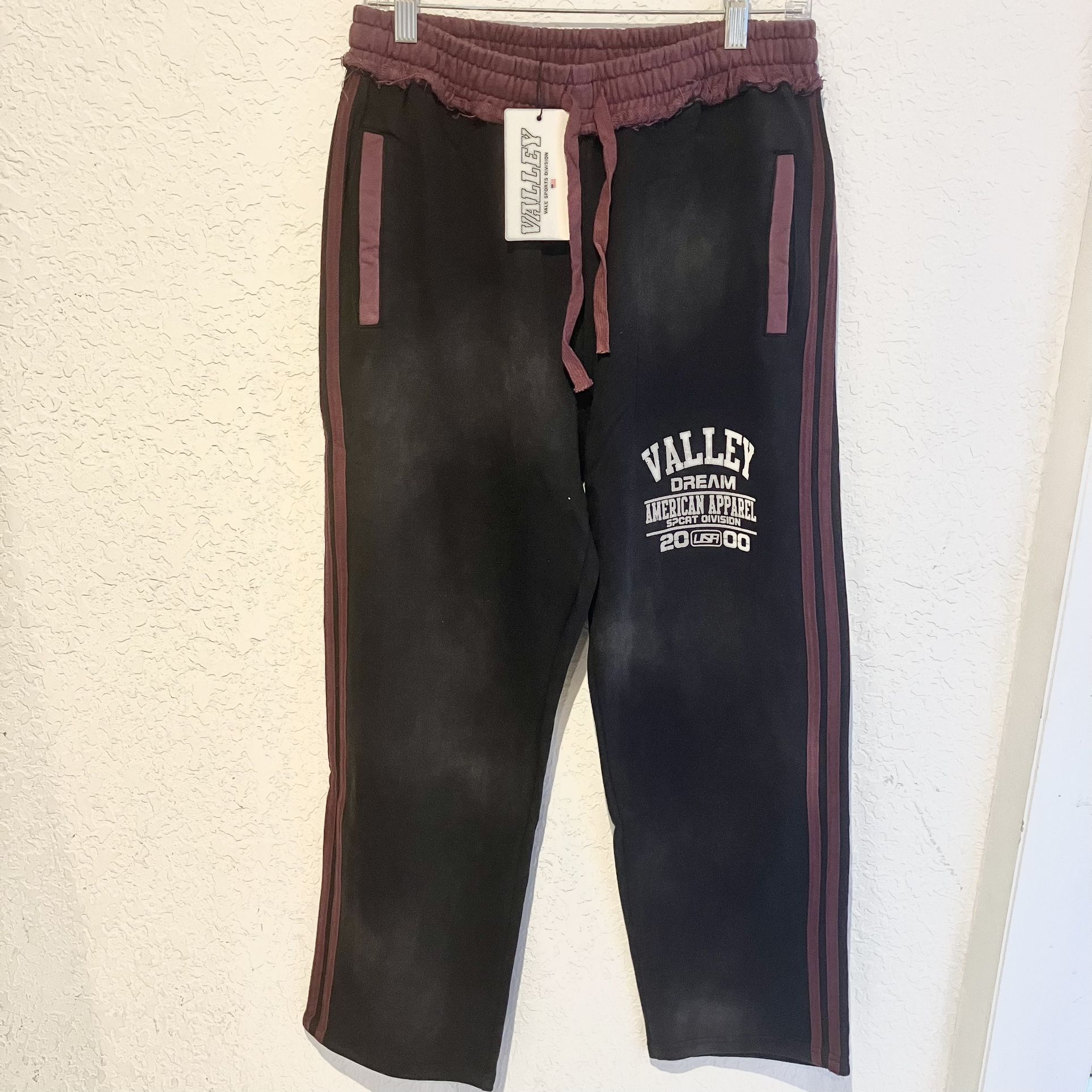 Vale Lives Forever black and burgundy distressed track pants joggers - Medium - brand new Tags: designer streetwear Saint chrome hearts vale lives forever denim tears hellstar valley men’s clothing sweats track pants white black red brown green pink fashion