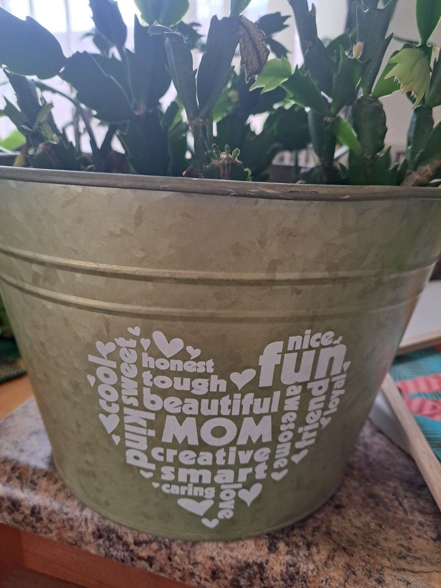 Red Christmas Cactus In Metal Pot