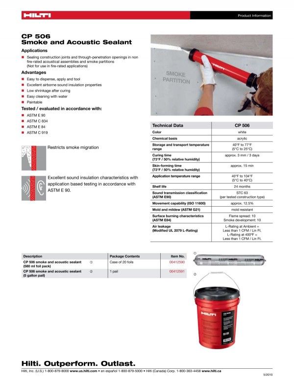 Hilti CP 506 Smoke & Acoustic Sealant - 19.6 oz sausage tube. Tubes dated 12.2018 - still soft and workable in sealed sausage tubes. Sealing construction joints and through-penetration openings in non fire-rated acoustical assemblies and smoke partitions (Not for use in fire-rated applications). Box=24 tubes retails for 330$ but im selling it for 1 tube 7$ or box for 24 tubes 150$