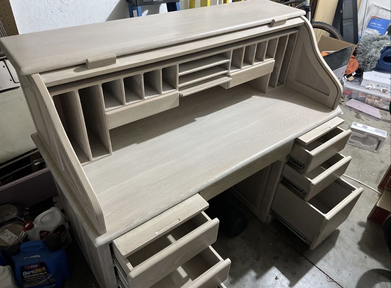 The Solid White Ash Wooden Desk by Ramer Bros features a removable topside storage with a slate cover, making it perfect for organizing and storing items in a home office or study. The desk is stylish with a solid pattern in light wood color, finished with lacquer for durability. With drawers for additional storage, this executive desk is both functional and aesthetically pleasing. The desk is 58 inches long, 48 inches high, and 30 inches wide, making it suitable for a spacious room. No assembly required.