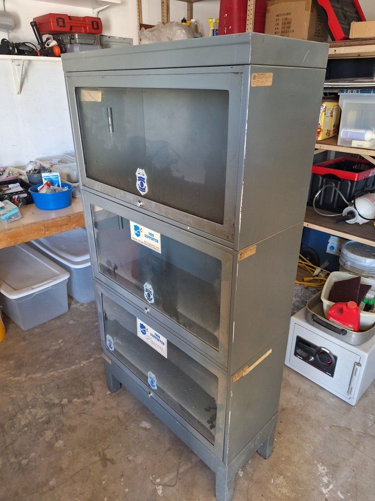 Medal cabinet with glass doors. 3 separate pieces that fit together Dirty and dusty but work fine Free