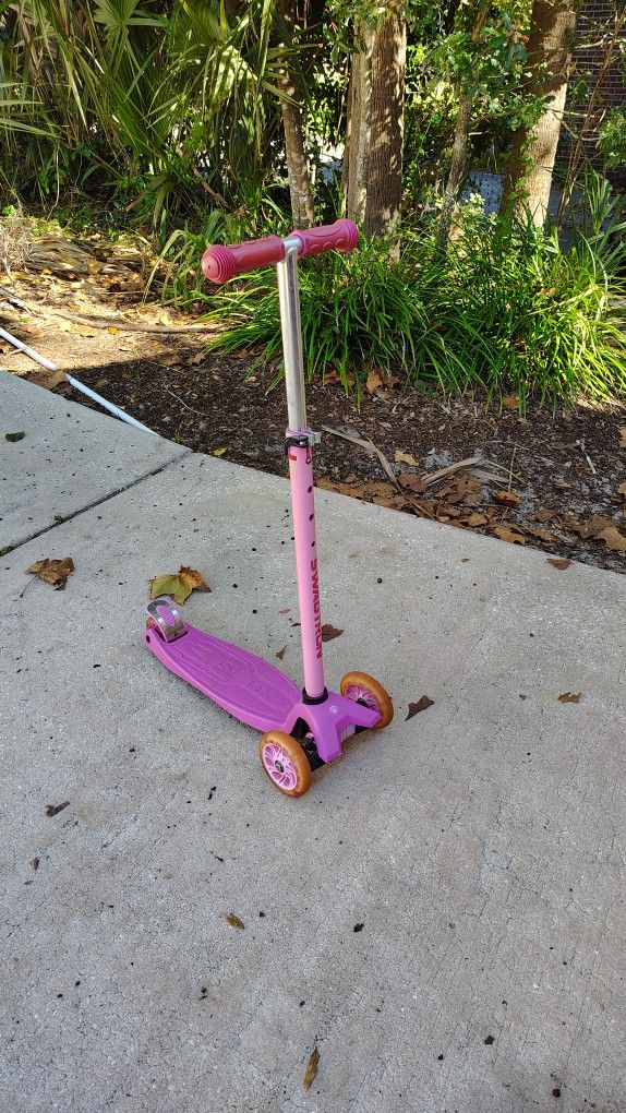 This 3 wheel scooter has a height adjustment stem that's easy to switch for your child. The wheels light up when riding it. When turning the scooter, you need to lean on the side you want to go. My girls loved this scooter, but they have outgrown it and they're wanting another kid to enjoy it like they did.