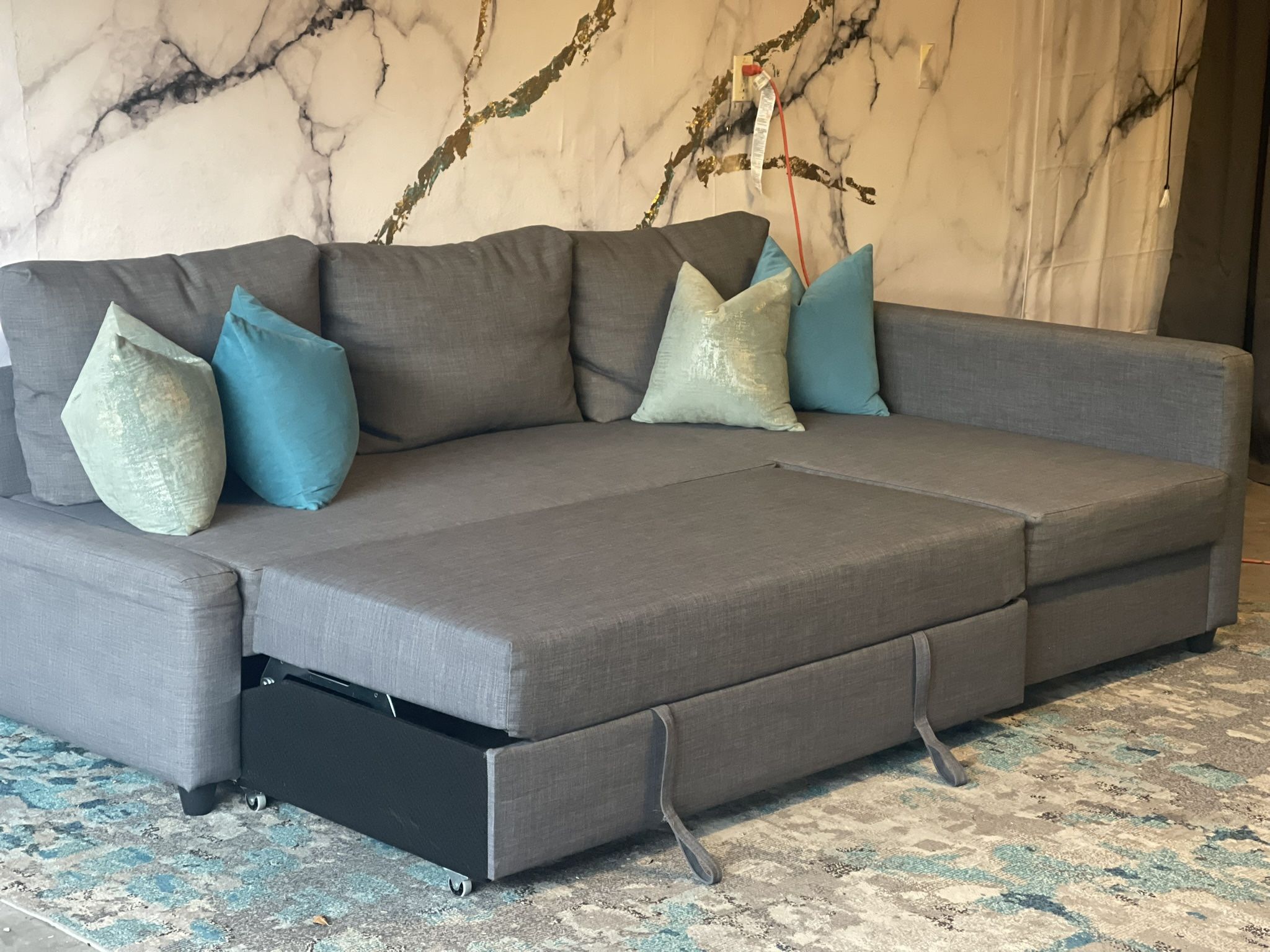 Gray IKEA sectional couch with pull out bed and storage Chaise. In an excellent condition with no stains rips or damage. Pick it up in Frisco or I help deliver it for free within 20 miles radius. Dimensions are in the last picture.