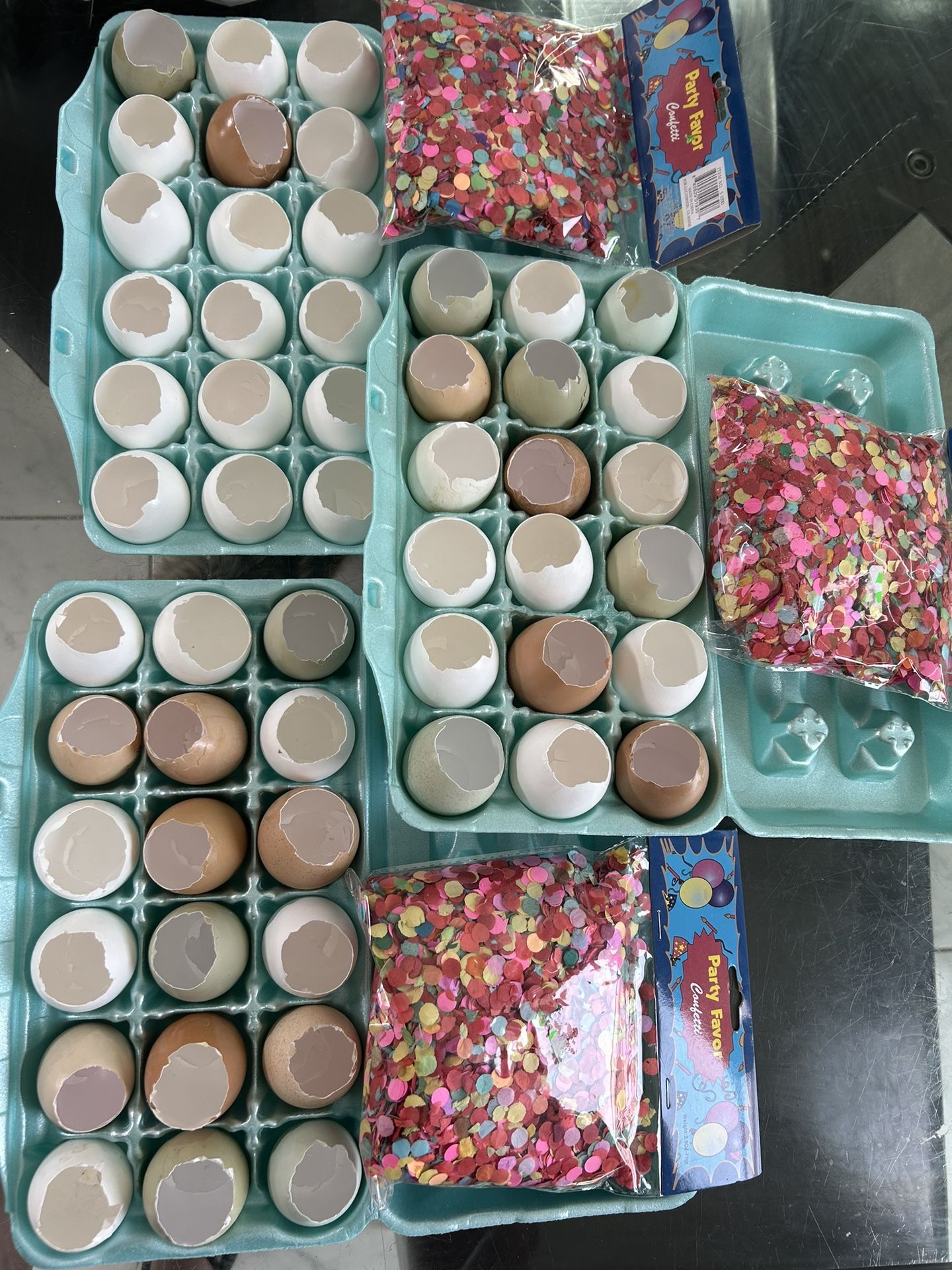 I have 10 packs of 18 egg shells with a bag of confetti for each one it’s great for kids to decorate how ever they like it it’s 5.00 each 18 pack located on the east side