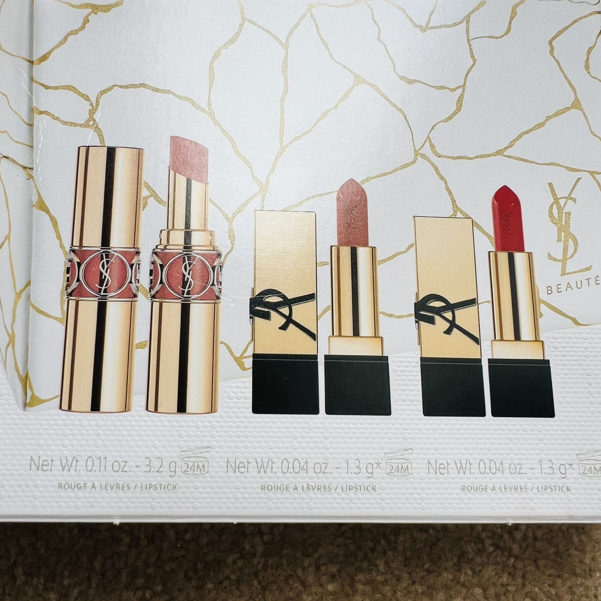 NWT LE Yves Saint Laurent Lipstick Set with Pouch Elegant 4pc. 1) Rouge Pur Couture Nu Muse NM 62x202 2) Rouge Pur Couture Rough Muse RM 62X204 3) Rouge Volupte Shine Nude Lingerie No150 62X400 4) a stylish zipper pouch, white gold marble color. 7.5 x 5.5 x 2" Perfect for gifting or personal use. Limited edition luxury designer family friend holiday gift home office kitchen work birthday anniversary valentines house warming wedding valentine's day girl friend mother father Christmas Halloween Thanksgiving party chef guest moving downsizing college dorm apple apartment storage traveling vocation computer laptop cellphone google designer ikea dania dinning room university student college moving target Macy's Wayfair amazon Costco bravern graduation bedroom bathroom authentic Walmart nordstrom