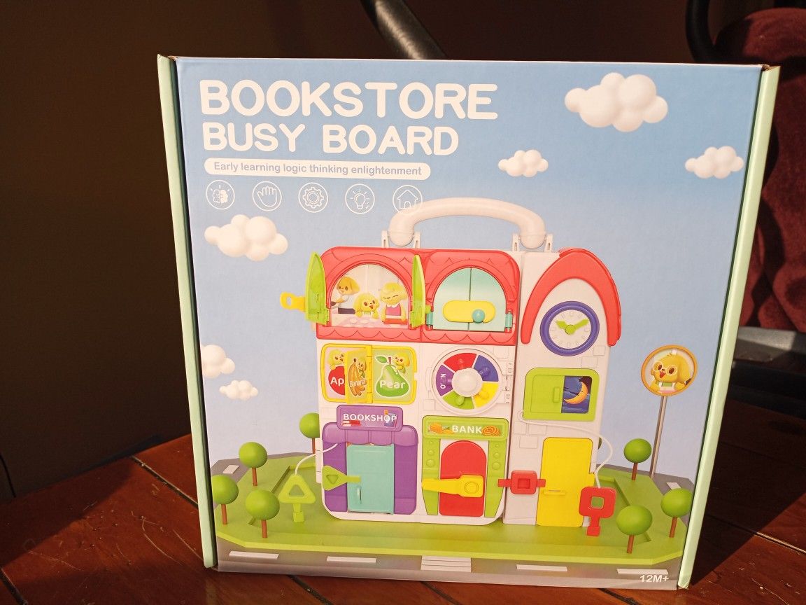 "Bookstore Busy Board. Early learning logic thinking enlightenment. Develop baby's smart brain. Hand training, daily cognition. Artistic color matching, multi-funtunal play." 12M+. Never opened...I found another gift, so I don't need it! MADE IN CHINA...you may not find one if you wait until Christmas!