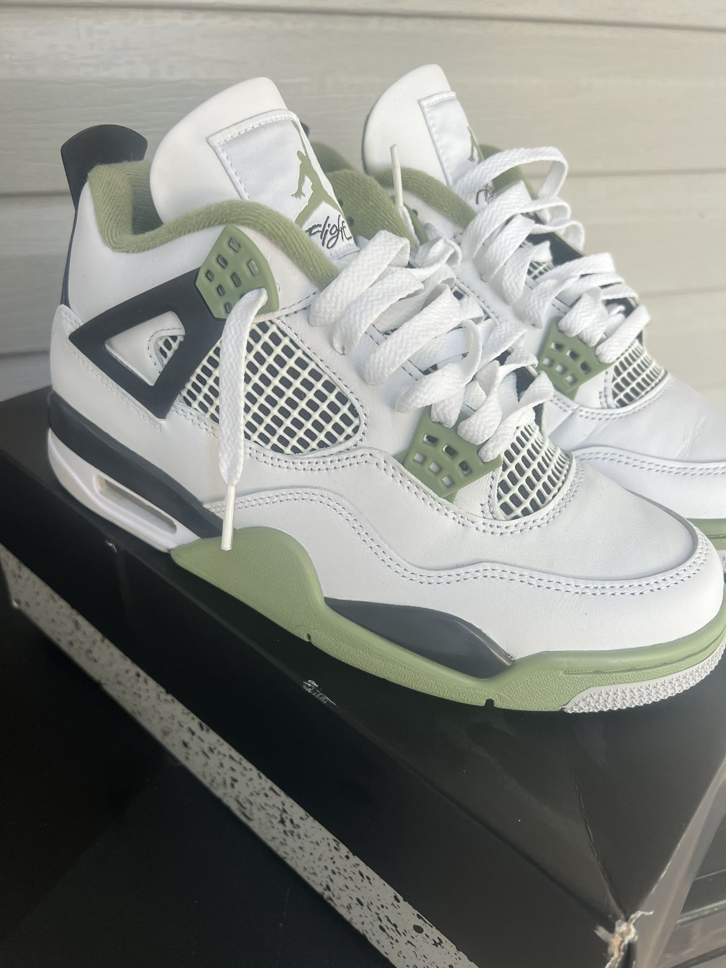Authentic Air Jordan 4 Retro Seafoam in women’s size 9. Shoes are in very good condition, worn only once and well taken care of. Uppers are clean, colors are vibrant, and soles show minimal wear. No rips, tears, or stains.