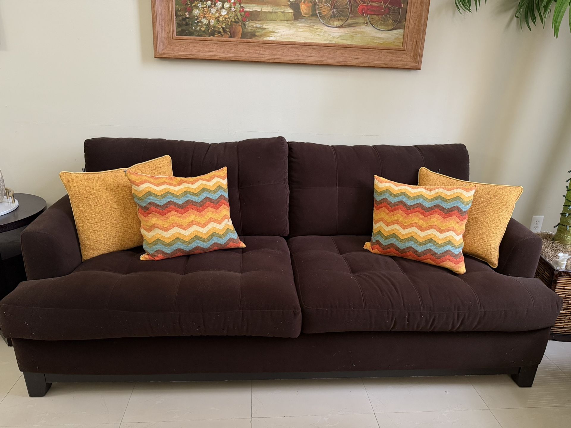 Originally purchased at City Furniture and maintained. This couch fits approximately 3-5 people, and is extremely comfortable. The material is suede.