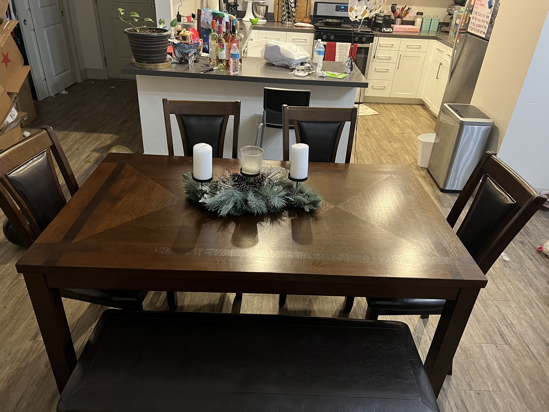 Dark Brown dining set with black leather cushioned seats. 4 chairs, 1 bench Used twice. Moving and don’t need. Delivery will be a fee and last resort. Minimal scratch on table, pictured.