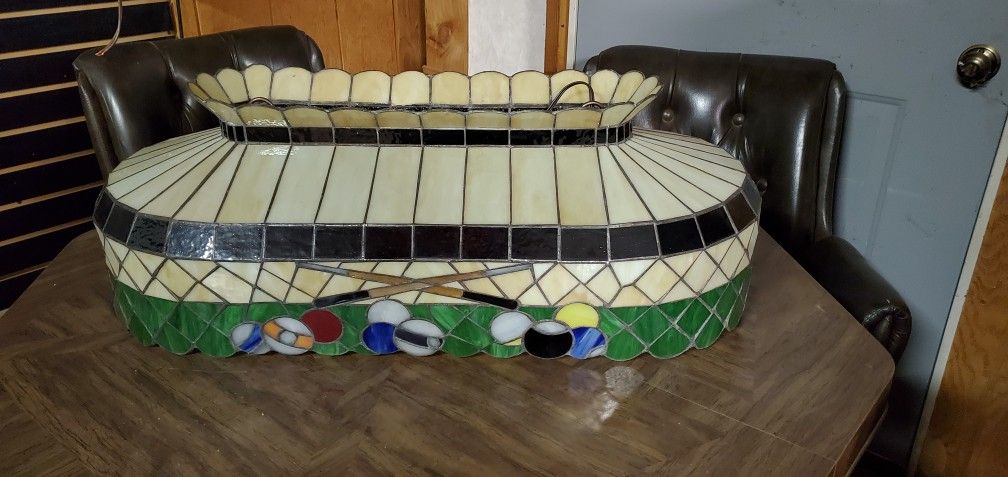 This is an old handmade Madea Tiffany stained glass mosaic billiards table lamp. Has two light fixtures attached that hold 3 bulbs each and a nice chain and ceiling mount. These sell for $1,500 online if you can find them, very rare piece. Letting it go for a great deal. Please Message me if you have any questions