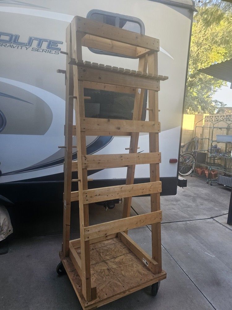 This 7' custom-made holder was designed for long wood clamps.There are notches at the top to hold a dozen or more on each side. This comes on four heavy duty casters. Make an offer