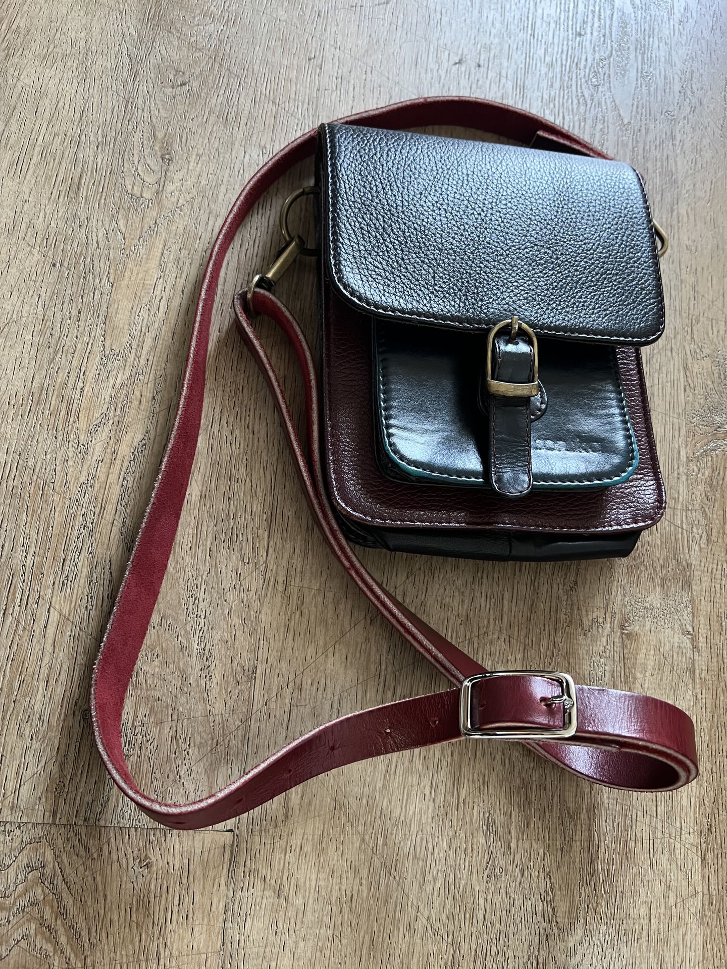 Elevate your accessory game with this stunning, one-of-a-kind crossbody bag from Soruka. Each bag is handcrafted using recycled leather scraps that would otherwise go to waste, making this an eco-friendly and sustainable choice for your wardrobe. Because of the way they are made, no two bags are exactly alike. This specific piece features a sophisticated palette of deep burgundy, classic black, and rich textured brown leather, accented by an adjustable red leather strap. Great condition.