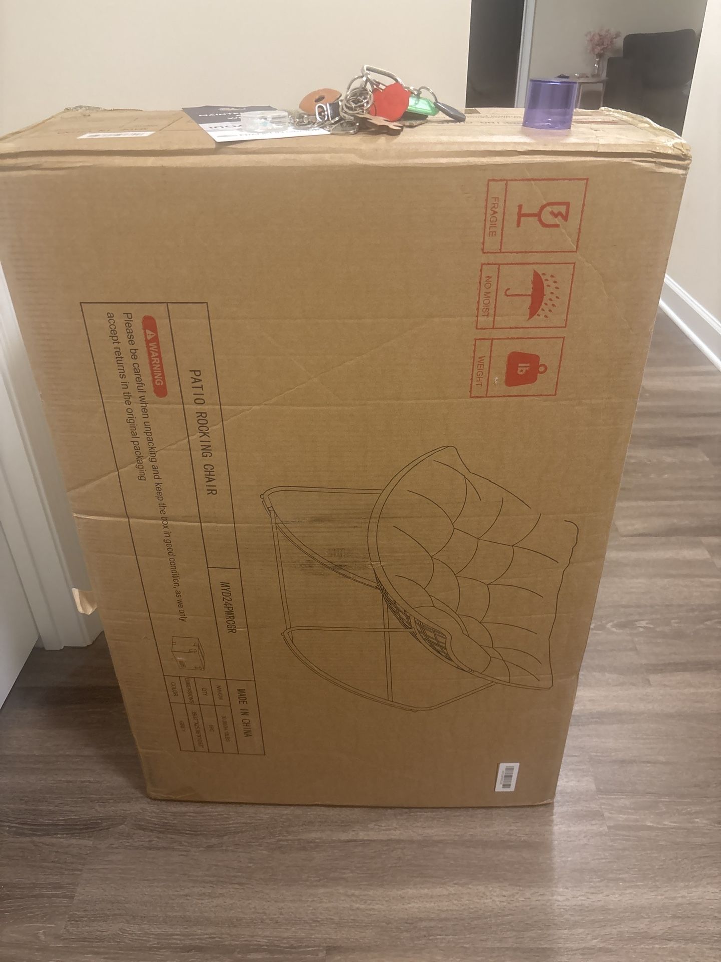 Brand-new patio rocking chair, never opened and still sealed in the original box. Perfect for a balcony, patio, or living room. Features a tufted cushion seat, metal rocking frame, and comfortable oversized design. Box is unopened — you’ll be the first to assemble it! Pickup in Virginia Beach