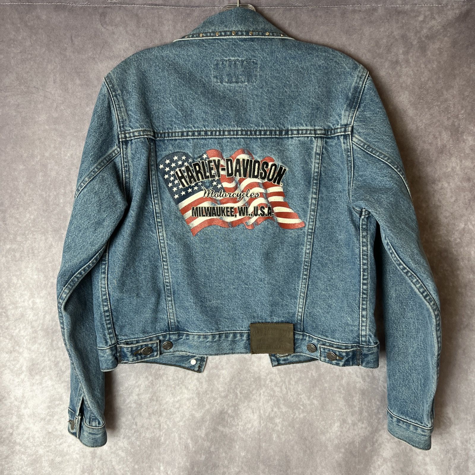 Harley-Davidson VTG Studded Denim Jacket XS Canada Embroidered Logo Flag READ