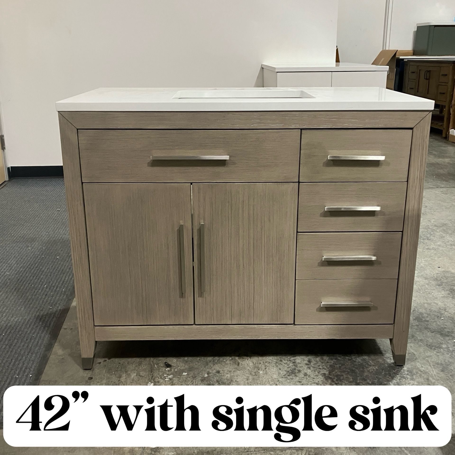 📌42” W x 22” D x 34” H Bathroom Cabinet 📌Single Sink Stone Countertop Bathroom Vanity 📌Solid Wood Constructed Bathroom Storage 📌Soft-closing Doors and Drawers 📌 Full extension dovetail pine wood drawers 📌Never used. Plus tax. 📌 Available in Other Sizes/Collections/Finishes 📍Showroom located at Ontario ✨Business Hours: Monday-Friday 9:00AM to 5PM Saturday 9:30AM to 5:30PM Address: 1845 S Vineyard Ave Suite 3 Ontario, CA 91761 Welcome to visit our showroom!