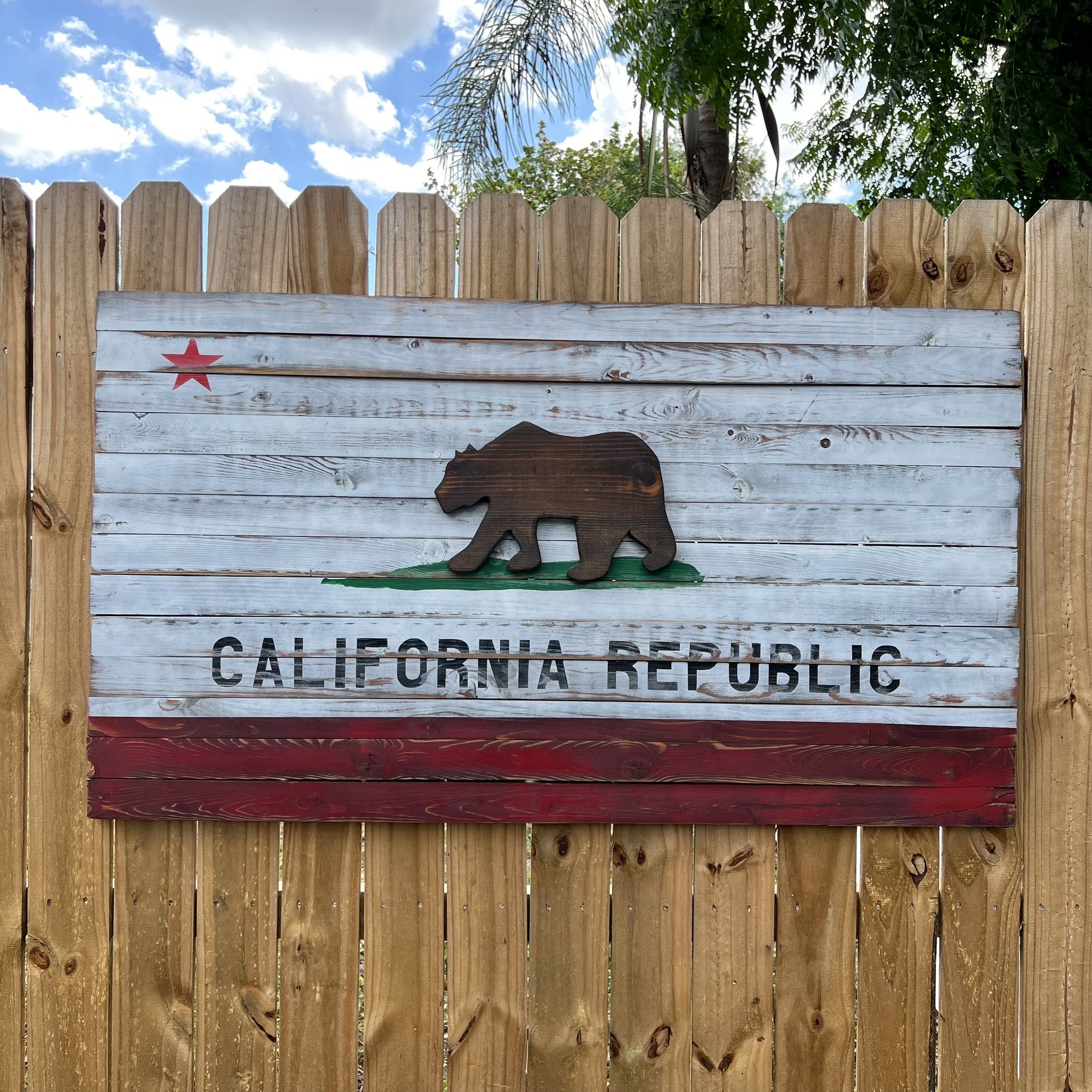 Handmade California State/California Republic wall art. The piece was handcrafted by the West Coast Patriot from select Douglas Fir wood using a 7 step process and painted with a distressed finish to create an aged look. Every piece is unique. The piece is 46”x26” and sold for over $300.
